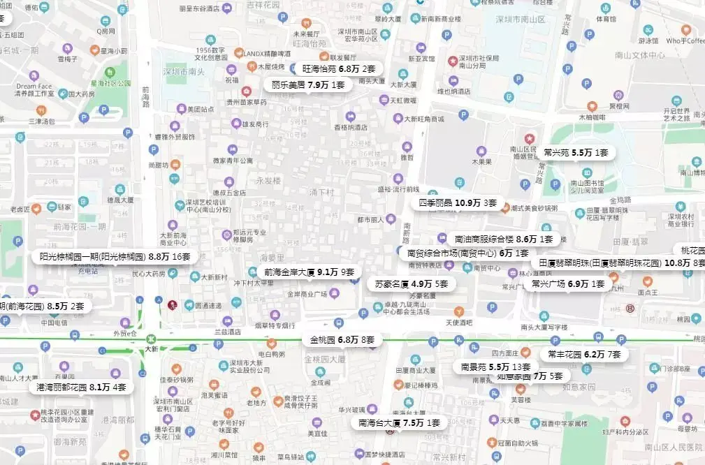当前,项目周边项目大多为2002年左右较旧小区,如金桃园、常兴广场、南景苑、如意家园等,二手挂牌均价在5-7万/㎡左右。背靠两大旧改的前海金岸,建成于2008年,均价也相对周边较高,挂牌均价在9万/㎡左右。